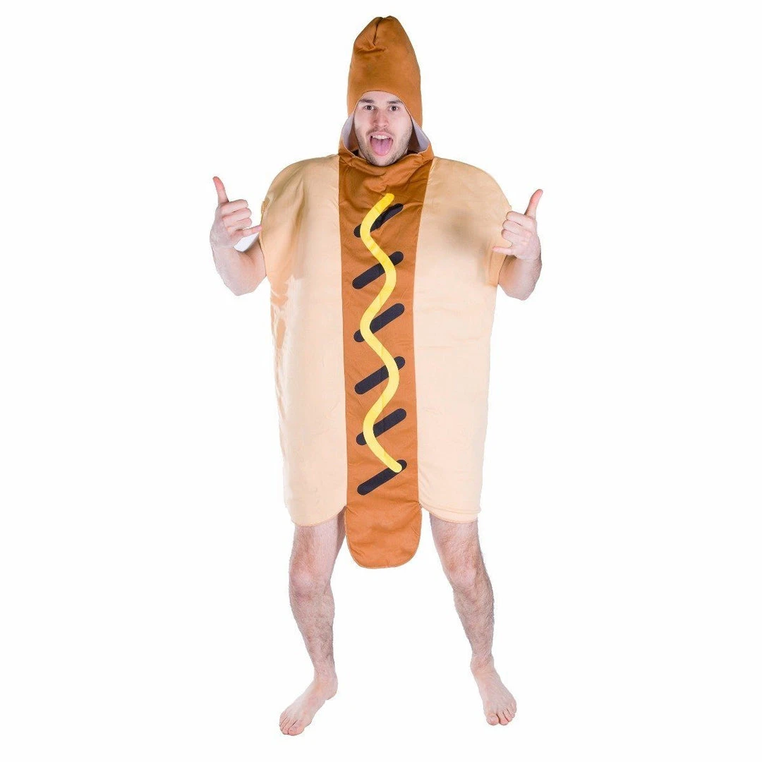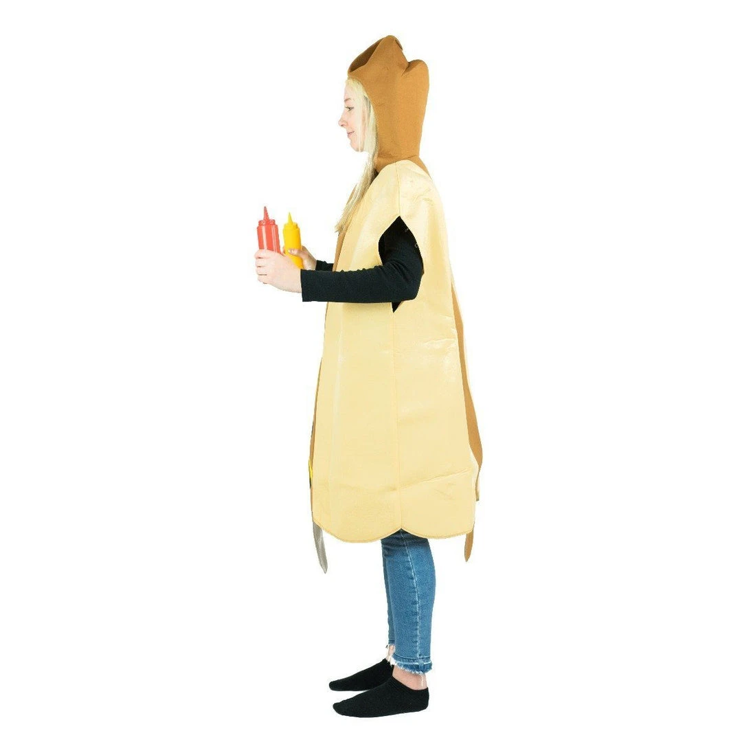 Roll up in our adult hot dog costume! Go as a group with our food & drink fancy dress or couple up as a hot dog and fries costume duo! Suit up with our saucy outfit!
