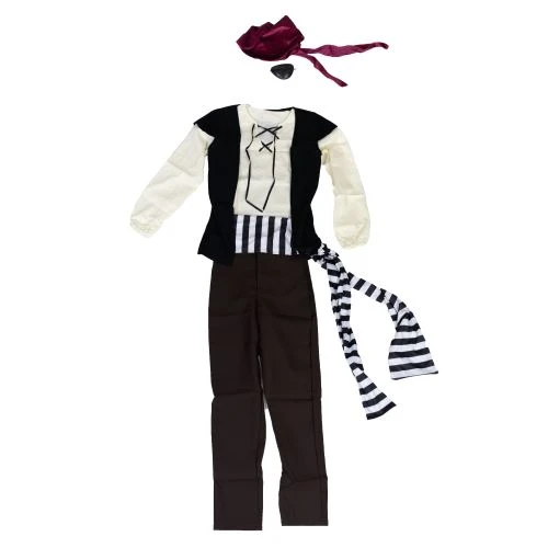 - Includes: bandanna, eye-patch, tie-up shirt, waistcoat, trousers and striped belt.